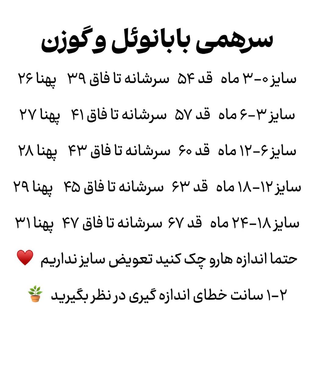 | سایز | ۱۲تا۱۸ ماه, ۱۸تا۲۴ ماه, ۲۴تا۳۶ ماه, ۹تا۱۲ ماه |