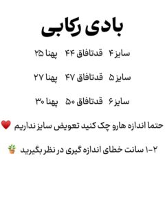 | سایز | سایز ۴۰, سایز ۴۵, سایز ۵۰, سایز ۵۵, سایز ۶۰, سایز ۶۵ |