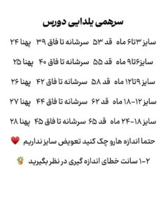 | سایز | ۱۲تا۱۸ ماه, ۱۸تا۲۴ ماه, ۳تا۶ ماه, ۶تا۹ ماه, ۹تا۱۲ ماه |