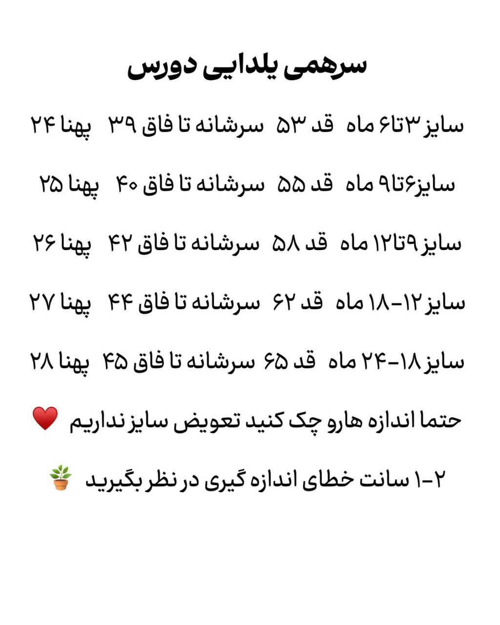 | سایز | ۱۲تا۱۸ ماه, ۱۸تا۲۴ ماه, ۳تا۶ ماه, ۶تا۹ ماه, ۹تا۱۲ ماه |