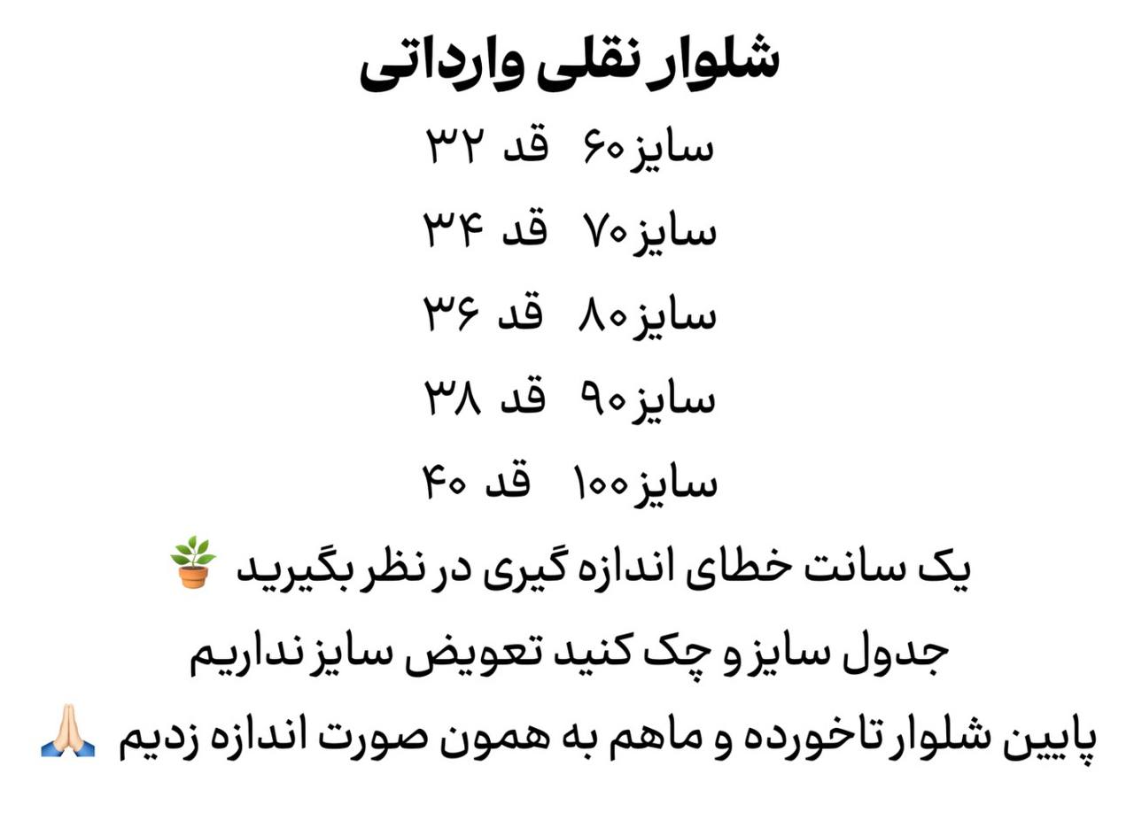 قد شلوار در حالت تا خورده اندازه گیری شده که اگر باز باشد ۳سانت اضافه میشود